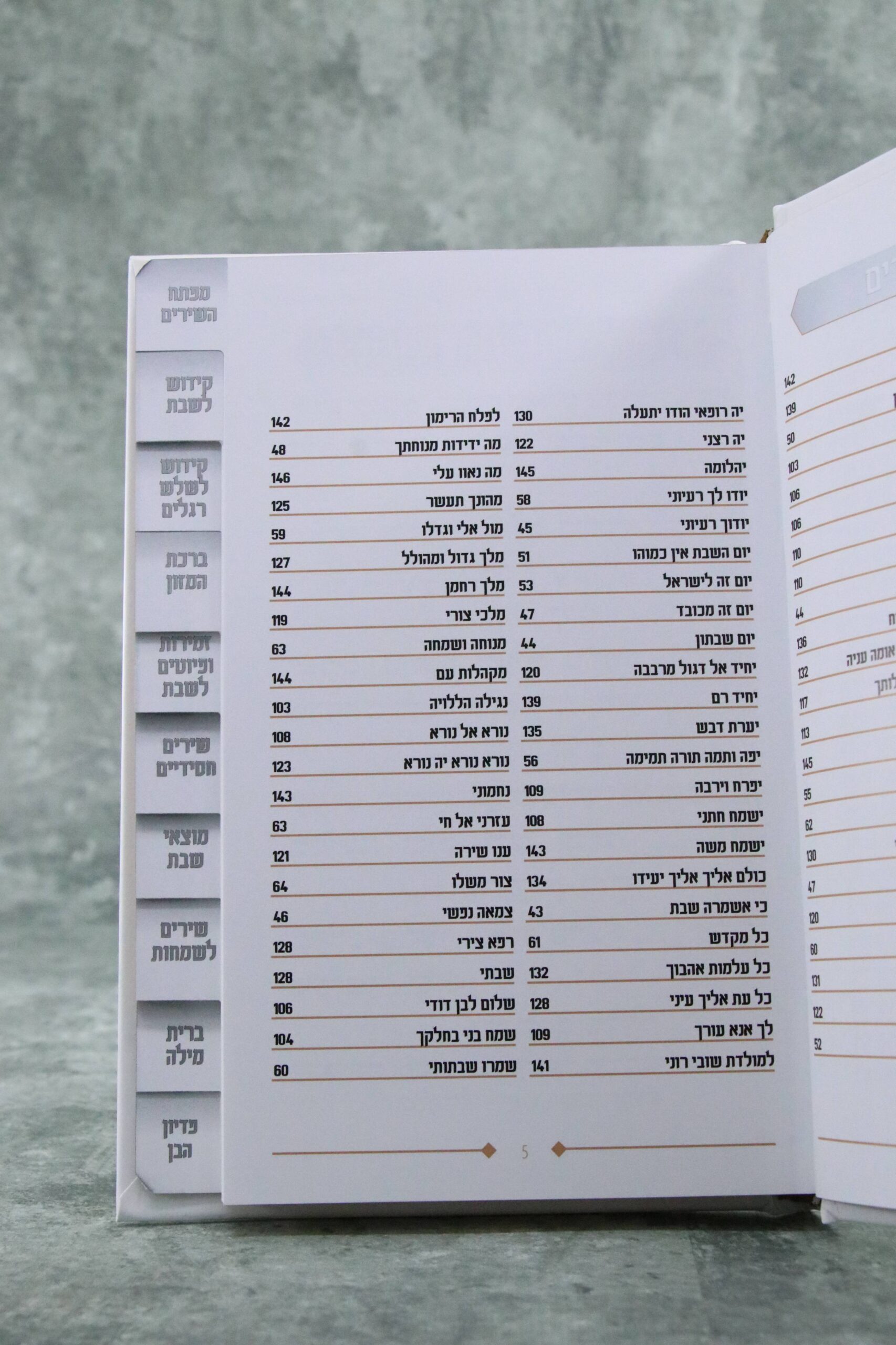כולל בתוכו סדר הקידוש לשבת וכל החגים, כל סוגי השירים כולל חגים ומועדים, שירי בקשות, ברכת המזון, ברכה מעין שלוש, סדר מוצאי שבת, סדר הבדלה, פיוטים למוצאי שבת, שבע ברכות . גודל הספר: בינוני – 12*17, גדול – 17*24 ס"מ.ניתן להוסיף הקדשה אישית לפי בחירה.
