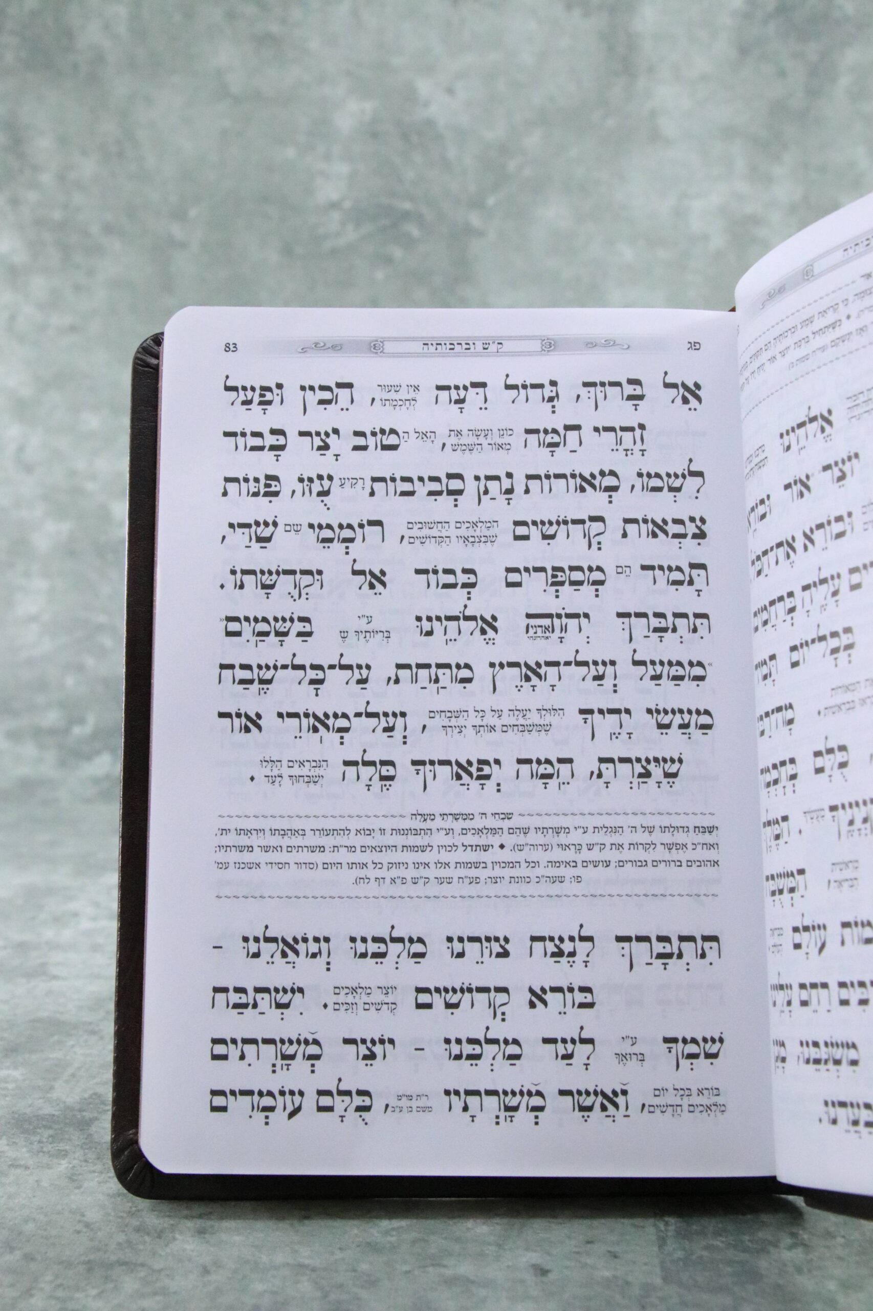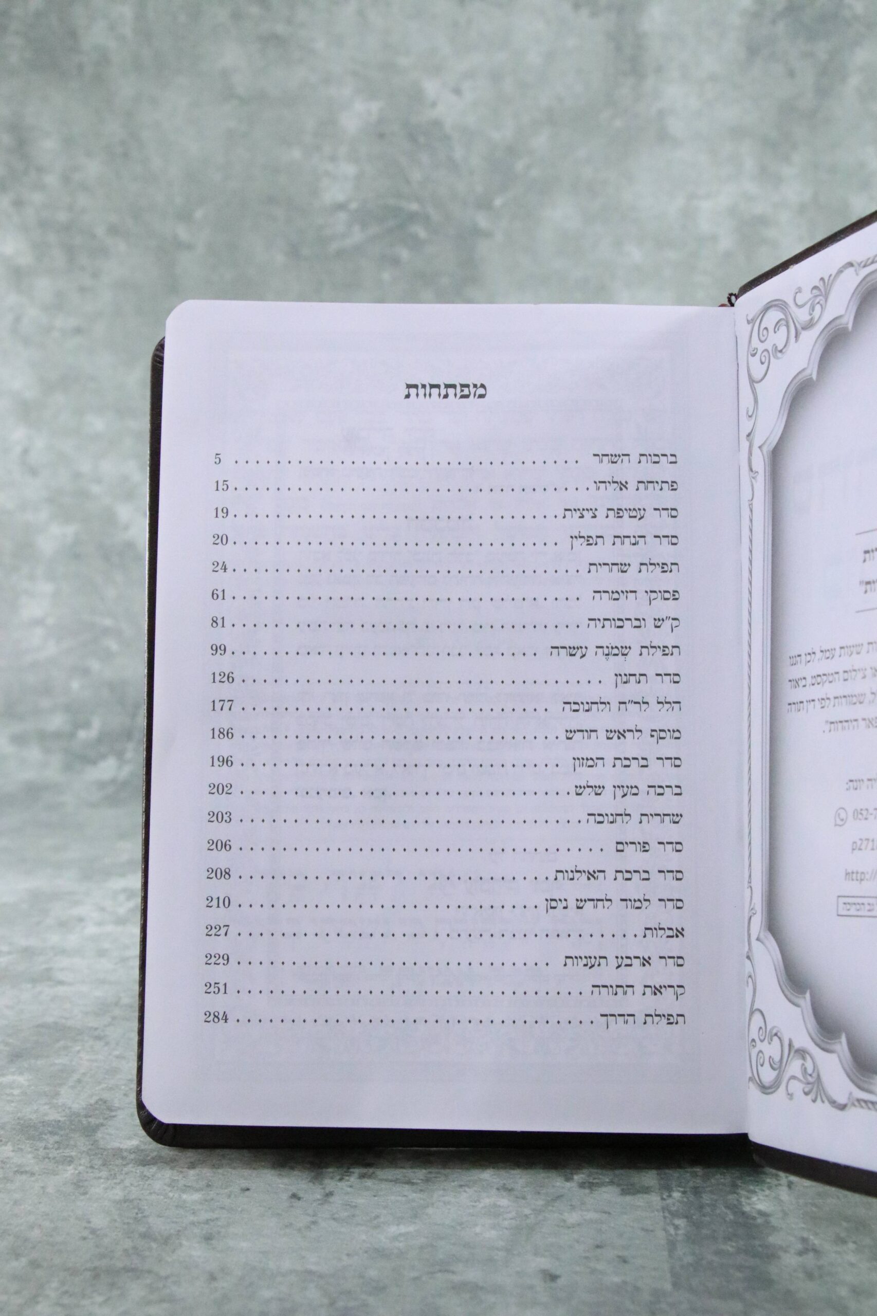 השבחות זהב או כסף לפי בחירה, כתב ברור גדול וקריא. טקסטורת עור מיוחדת בהטבעת חום מושקעת, נוסח עדות המזרח. כולל בתוכו תהילים בסוף הסידור. גודל הסידור: 14.5*10.5 ס"מ.ניתן להוסיף הקדשה אישית לפי בחירה.