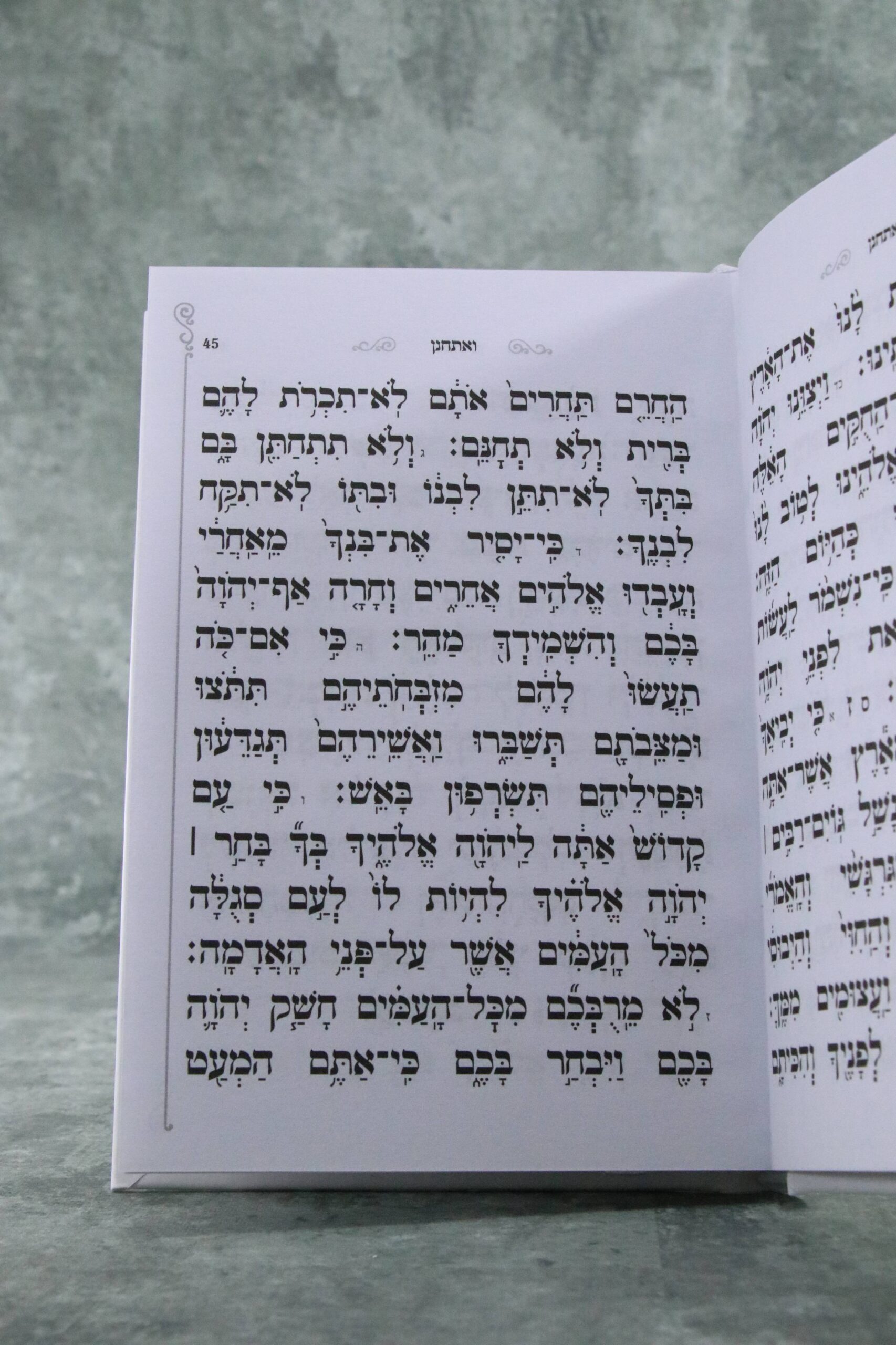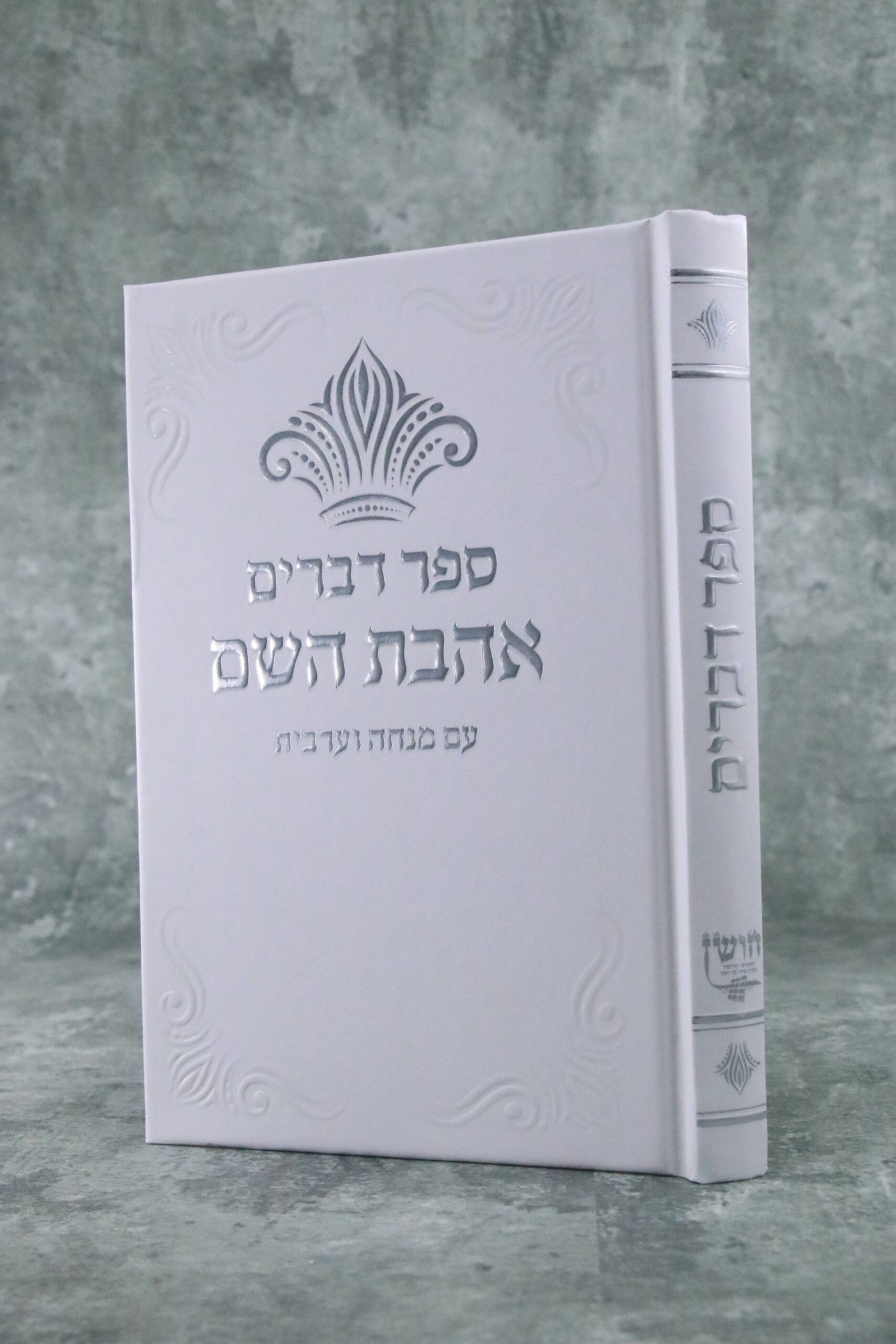 ספר בינוני כריכה קשה בציפוי למינציה מט. השבחות כסף או זהב לפי בחירה, נוסח עדות המזרח. מקום מיוחד להטבעה, עיצוב יוקרתי ומהמם. כולל בתוכו מנחה וערבית, ספירת העומר, ברכת המזון. שבע ברכות, איגרת הרמבן, נשמת כל חי ותפילת הדרך. גודל הספר: 12*17 ס"מ.ניתן להוסיף הקדשה אישית לפי בחירה.