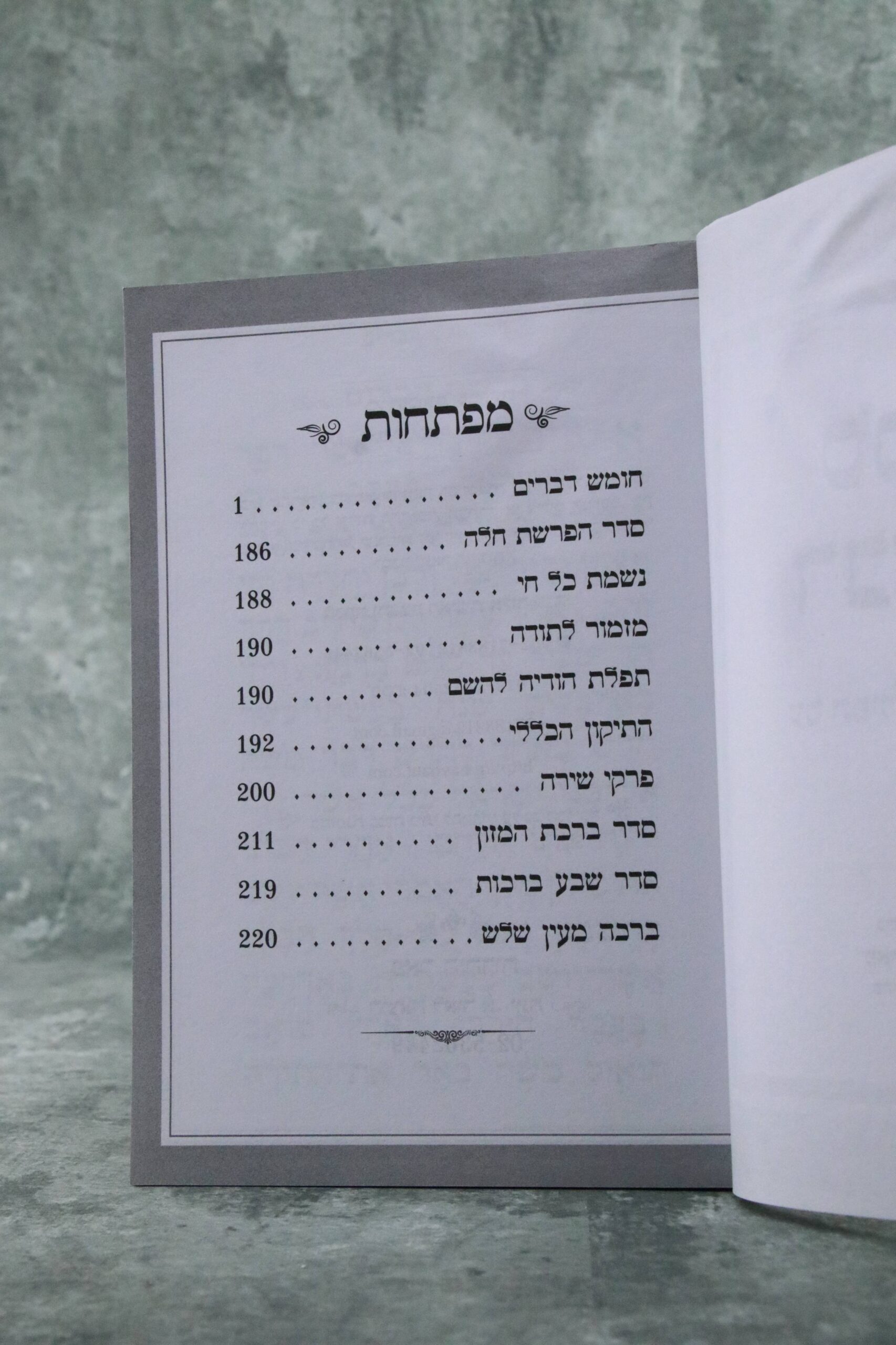 ספר בינוני כריכה קשה בציפוי למינציה מט. השבחות כסף, נוסח עדות המזרח. עיצוב יוקרתי ומהמם. כולל בתוכו הפרשת חלה, נשמת כל חי, מזמור לתודה ותיקון הכללי. פרק שירה, ברכת המזון, סדר שבע ברכות וברכת מעין שלוש. גודל הספר: 12*17 ס"מ.ניתן להוסיף הקדשה אישית לפי בחירה.