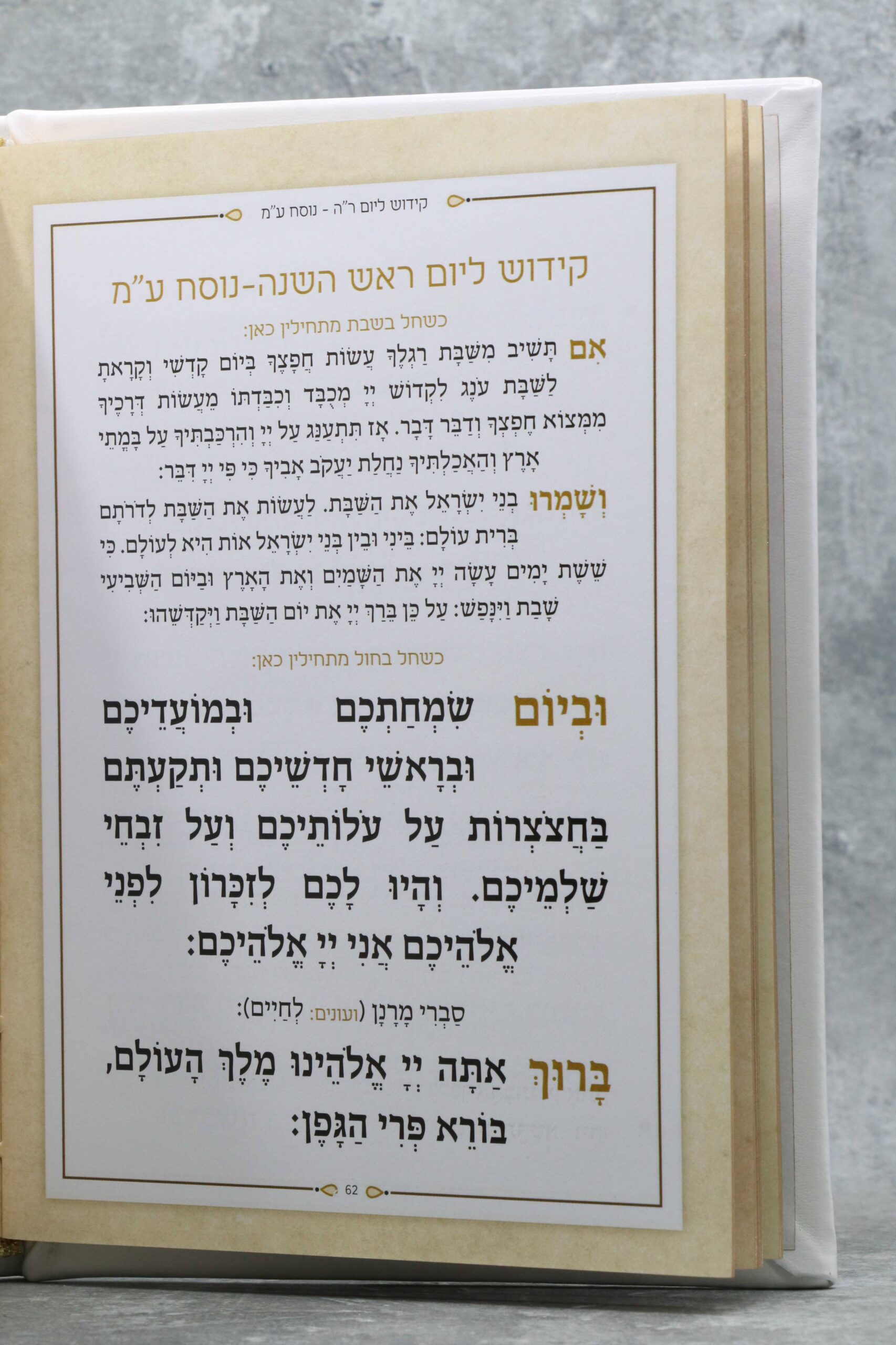 ספר הקידוש בינוני כריכת דמוי עור קשה עם הבלטות בלינד מיוחדות.